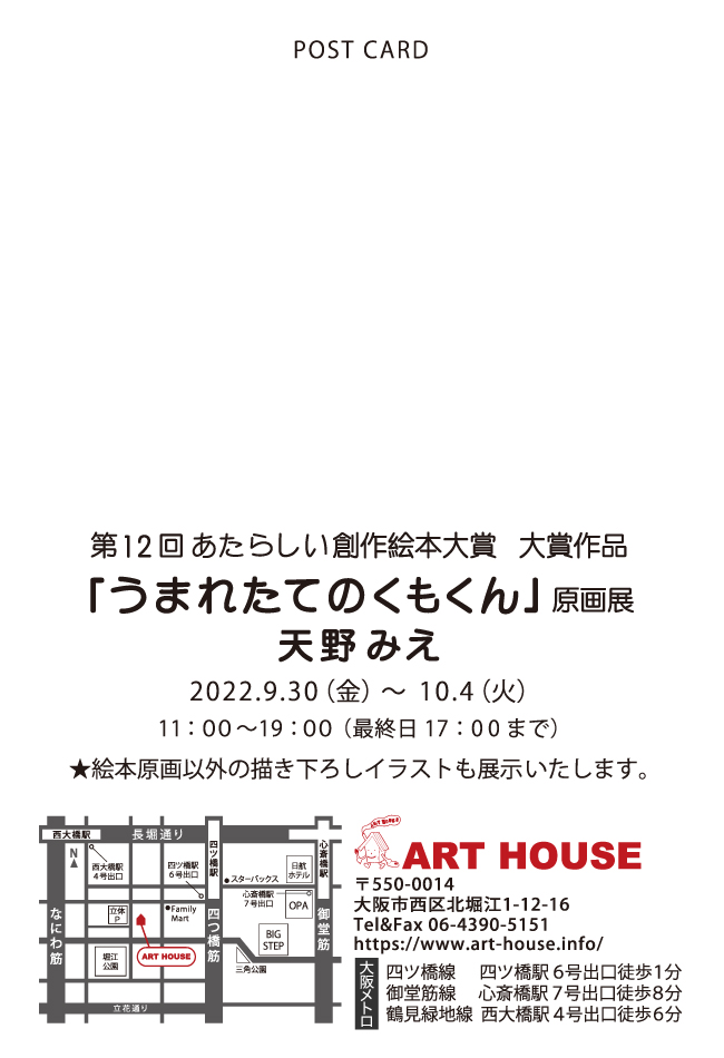 コンテスト情報 お知らせ 絵本教室 あたらしい創作絵本大賞 「うまれたてのくもくん」原画展 2022年9月22日 2022年9月22日 amini 第12回あたらしい創作絵本大賞・大賞受賞作『うまれたてのくもくん』天野みえさんが、 2022年9/30〜10/4 大阪の北堀江にあるART HOUSEで原画展を開催します。 書き下ろしイラストもあります。受賞作の本も買えます! ぜひ、どうぞ! 日時:2022年9月30日〜10月4日 会場:ART HOUSE(大阪市西区) Facebook postはてブLINEPocketFeedly